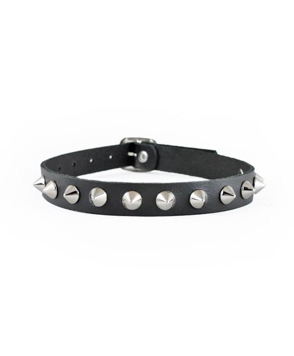 kožený pásek na krk zdobený kužely o průměru cca 1 cm se zapínáním na sponu. Rozměry: šířka cca 3 cm, délka cca 30,5 40 cm.