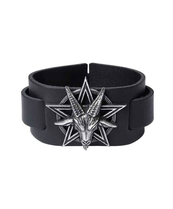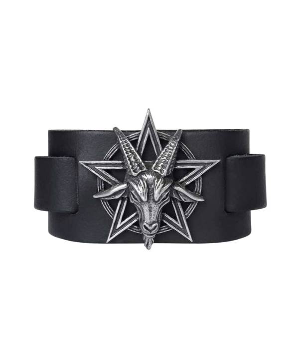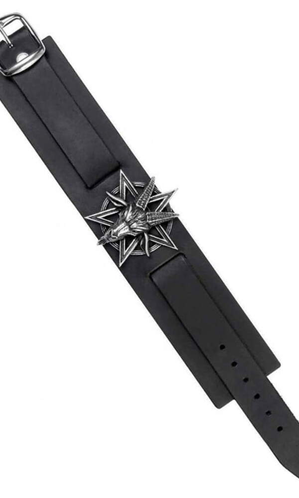 Náramek BAPHOMET. Pásek je vyrobený z černé kůže. Zdobený kovovým odlitkem ve tvaru kozí hlavy na pentagramu. Zapínání na přezku.