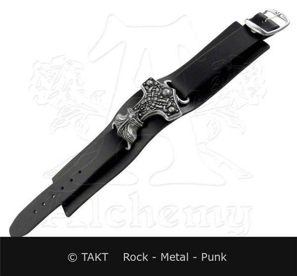 Kožený opasek na ruku . Barva: černá. Zdobený kovový odlitek ve tvaru thorovo kladivo. Jeho rozměry jsou cca: šířka 5 cm, regulovatelná délka zapnutí na zápěstí cca 18 - 24 cm.