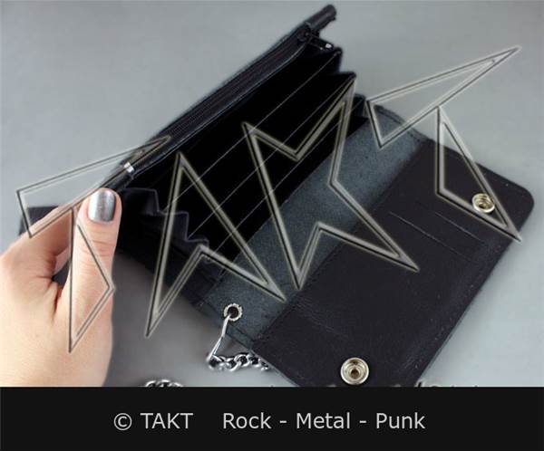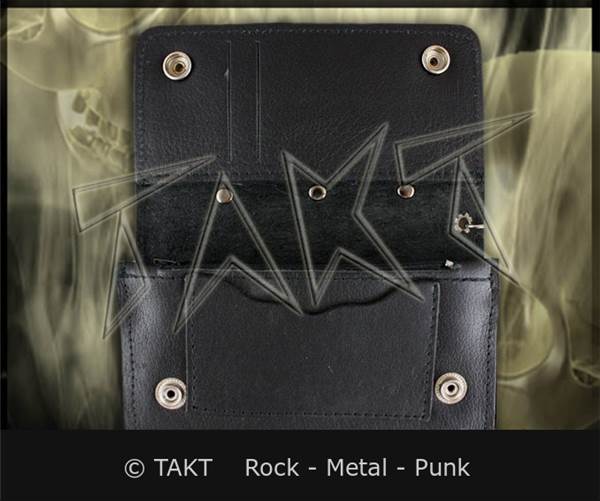 Velmi pěkná zdobená peněženka se vzorem AMERICAN BIKER. Zapíná se na dvě velké kovové spony. Uvnitř má přihrádky na doklady, prostor na bankovky a kapsu na mince na zip. Připojený kovový řetízek má ozdobný kožený pásek se zapínáním na patentku, který lze připnout k poutku kalhot.