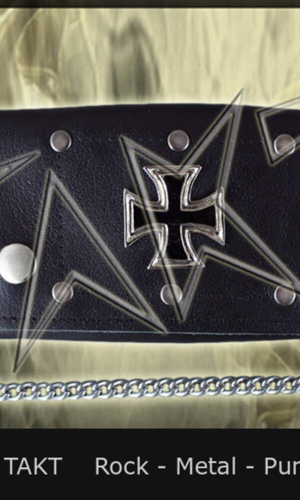 Vyrobena z kůže, obšitá černou nití zdobená cvoky a ornamentem ve tvaru rytířského kříže. Zapínání je na dva kovové cvoky, uvnitř je prostor pro osobní dokumenty, prostor na papírové bankovky a kapsa na zip na kovové mince. Peněženku doplňuje kovový řetěz na dvě karabinky a dekorativní kožený pásek upevněny na cvok, který lze zapnout k poutku u kalhot. Rozměry: zavřená cca 16,5 x 9 cm, otevřená cca 16,5 x 19,5 cm, délka řetězu i s karabinami cca 34 cm.