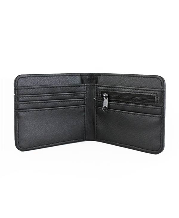 Licence - Import. Peněženka z ekologické kůže, lemovaná černými nitěmi. Verze Premium - materiál imitující vzhled přírodní kůže. Zdobená potiskem na přední a zadní straně peněženky. Obsahuje přihrádky na doklady a platební karty a vnitřní kapsu na zip.