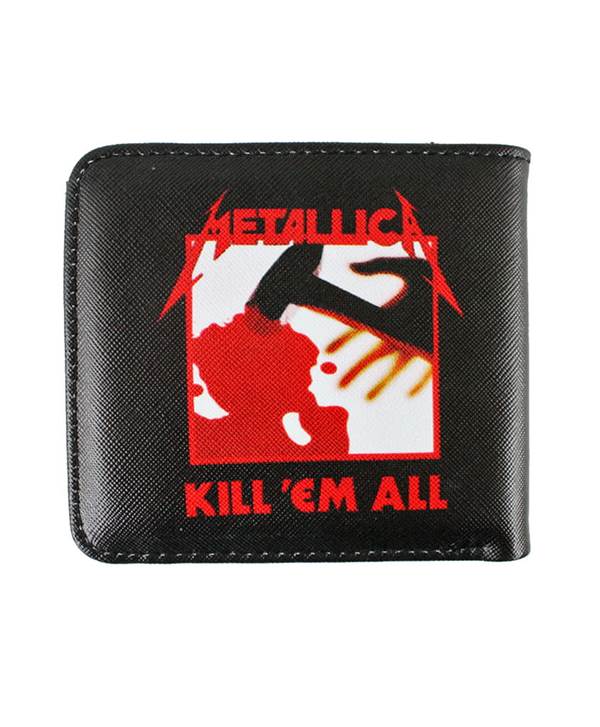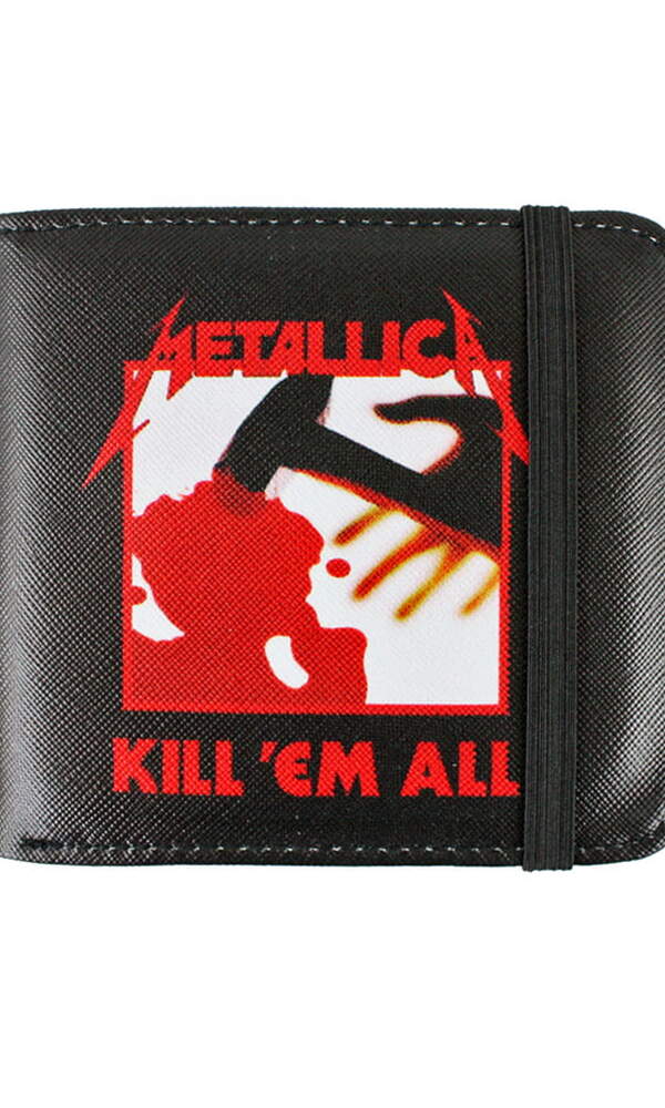 Licence - Peněženka Metallica. Vyrobená z ekologické kůže, zdobené černými nitěmi. Zdobené potiskem na celém vnějším povrchu. Uvnitř má přihrádky na dokumenty a platební karty a kapsu na zip. Peněženka je uzavřená gumičkou.