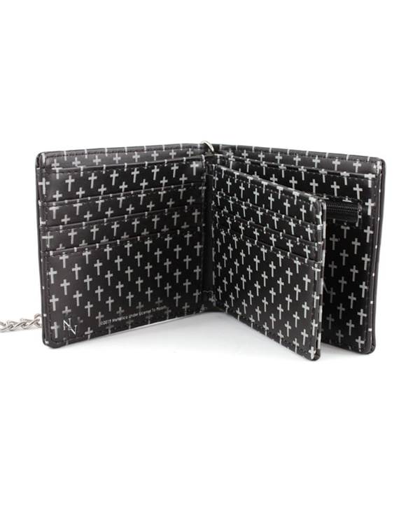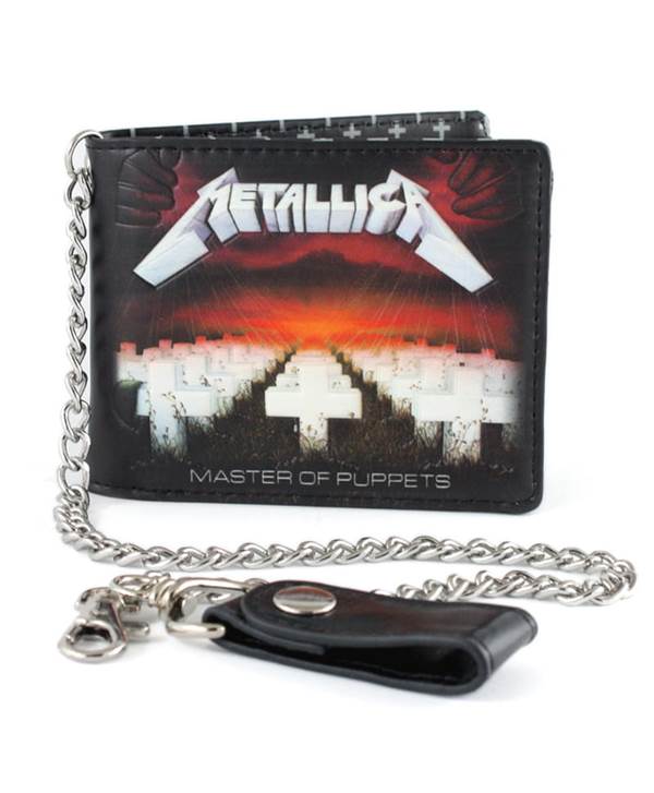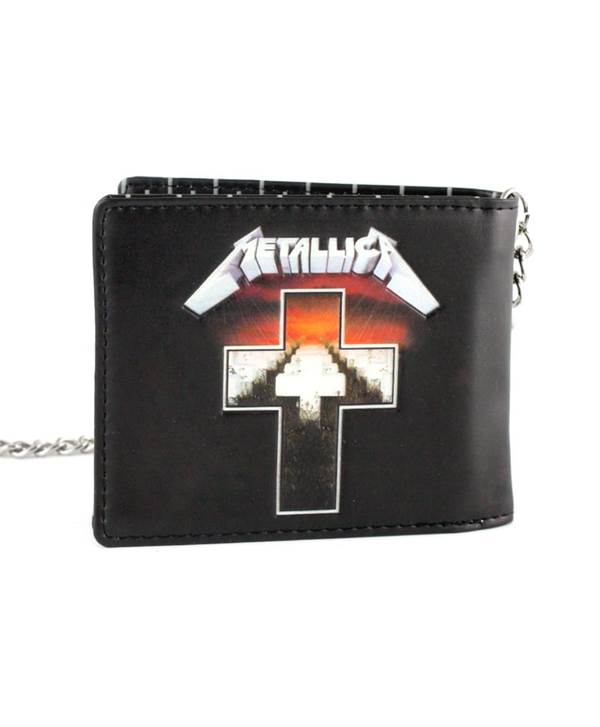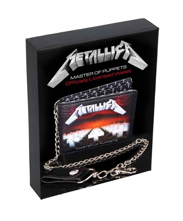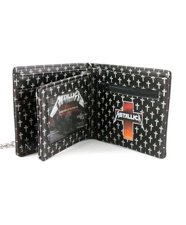 Vyrobeno z ekologické kůže, zdobené černými nitěmi na obou stranách zdobená reliéfním logem METALLICA a potištěnou uvnitř metodou ALL PRINT. Má četné přihrádky na dokumenty a bankovky. Připojený kovový řetěz má karabinu a kožený řemínek, který lze připevnit ke smyčce na kalhotovém pásu.