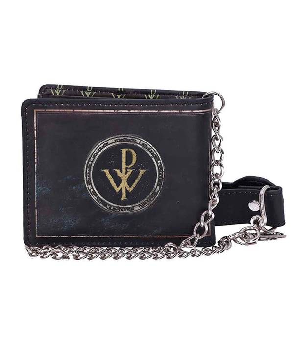 Licence Import - Peněženka s řetízkem POWERWOLF. Vyrobeno z ekologické kůže, lemované černou nití. Peněženka je oboustranně zdobená reliéfním potiskem a uvnitř potiskem ALL PRINT. Má mnoho přihrádek na dokumenty a poznámky. Přiložený kovový řetízek má karabinku a kožený pásek, který lze připnout k poutku na opasek. Peněženka byla vyrobena velmi pečlivě.