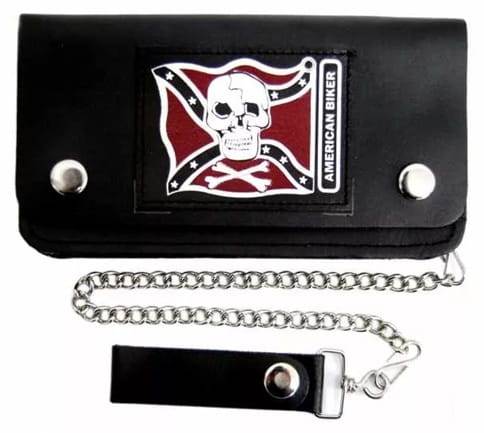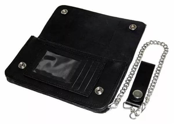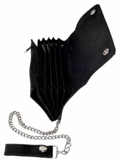 Velmi pěkná zdobená peněženka se vzorem AMERICAN BIKER. Zapíná se na dvě velké kovové spony. Uvnitř má přihrádky na doklady, prostor na bankovky a kapsu na mince na zip. Připojený kovový řetízek má ozdobný kožený pásek se zapínáním na patentku, který lze připnout k poutku kalhot.