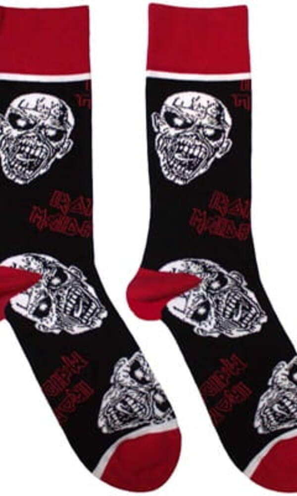 Dopřejte svému stylu pořádnou metalovou dávku s ponožkami Iron Maiden – Eddie Skulls, které oslavují ikonického maskota kapely Iron Maiden – Eddiego. Design v černo-červeno-bílé barevné kombinaci zdobí opakující se motiv Eddieho lebek a typické logo kapely, což z těchto ponožek dělá výjimečný doplněk pro každého fanouška heavy metalu.