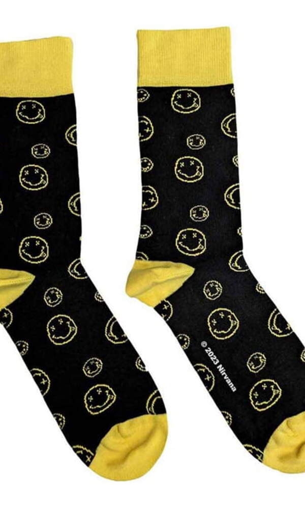 Ponožky Nirvana - Happy Faces Yellow jsou stylový doplněk pro fanoušky legendární grunge kapely a oficiálního merchandisu. Černý podklad doplňují výrazné žluté detaily a ikonické smajlíky, které jsou neodmyslitelně spojené s vizuální identitou kapely. Díky kontrastnímu designu ponožky zaujmou na první pohled.