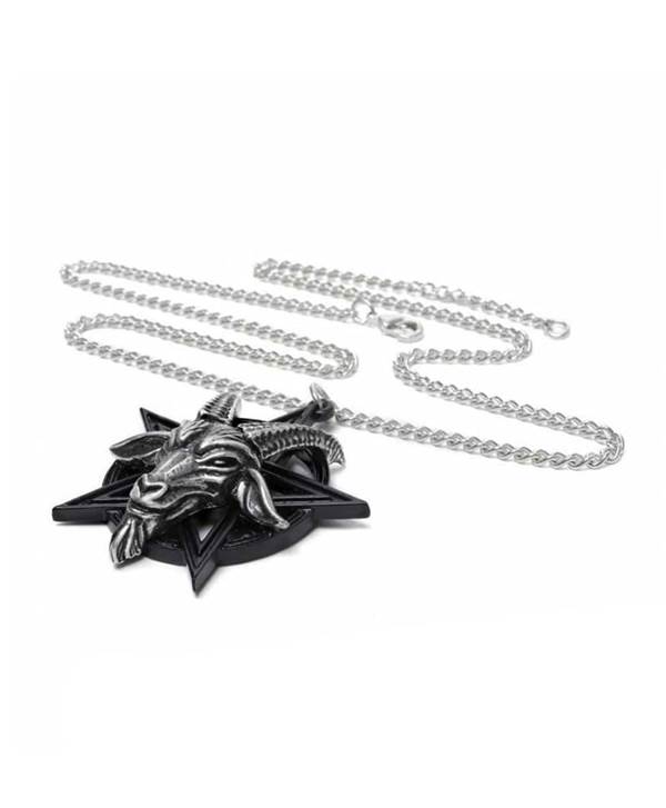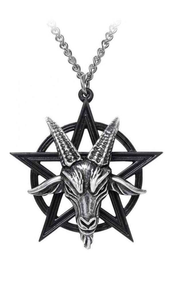 Masivní kovový odlitek ve tvaru kozí hlavy na pentagram. Zavěšeno na stříbrném řetězu připevněném karabinou.
