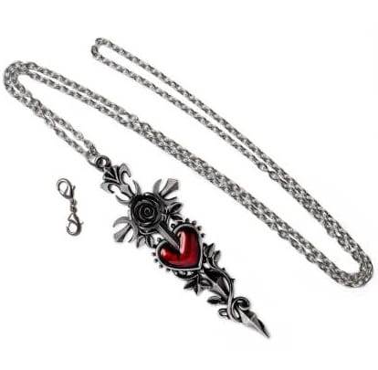 Přívěšek Alchemy Cross Of The Dark Kiss je dramatickým a výrazným gotickým šperkem, který dokonale kombinuje symboliku kříže, růže a srdce. Tento přívěšek v barvě antického stříbra je zdoben propracovanými detaily, kde černá růže a rudé srdce tvoří mystický kontrast, symbolizující vášeň, lásku a temnotu. Srdce je vyvedeno v lesklé červené barvě, což přidává přívěsku nádech romantické elegance i gotické tajemnosti.