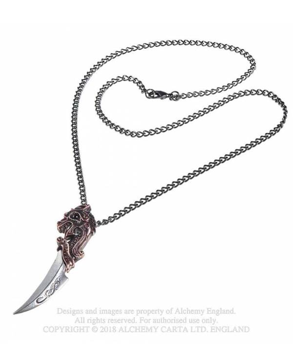 Licence - Import Alchemy England. Dvoubarevný přívěsek s vyobrazením zahnuté dýky se starohnědou rukojetí, hlavou vikingského draka a malým černým okem. Zavěšeno na řetízku s karabinkou.