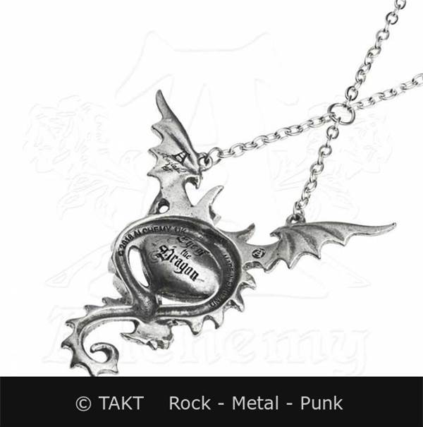 Licence ALCHEMY ENGLAND. Kovový náhrdelník stříbrné barvě ve tvaru drak. Zapínání na karabinku. Rozměry: draka cca 6 x 6 cm celková délka náhrdelníku cca 63 cm.