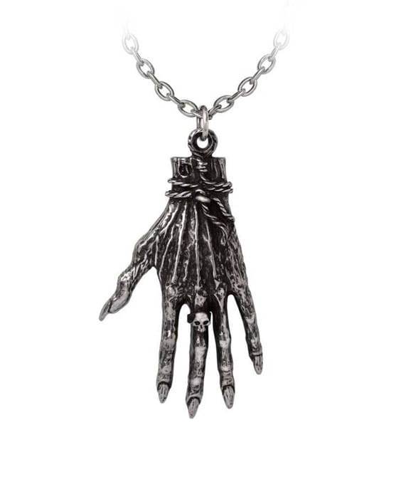 Licence - Alchemy Gothic. Masivní replika ruky se špičatými nehty, jemným kroužkem ve tvaru lebky a modře vykládanou oční bulvou. Kovový odlitek, přívěsek stříbrné barvy s lakovanými prvky. Přívěšek je zavěšený na řetízku.