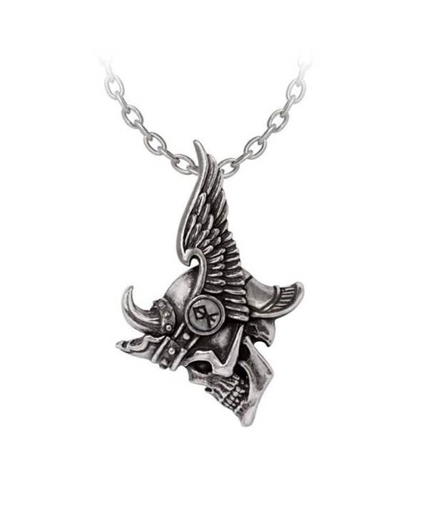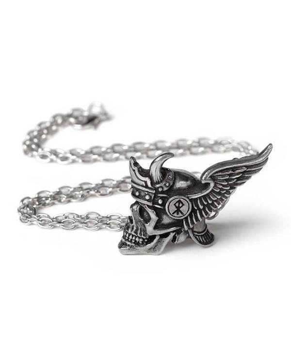 Licence - Import Alchemy England. Leštěný cínový přívěsek inspirovaný Vikingy. Vikingská lebka z bočního profilu má rohatou okřídlenou přilbu. Zavěšena na řetízku stříbrné barvy s karabinkou.