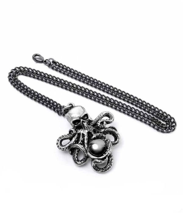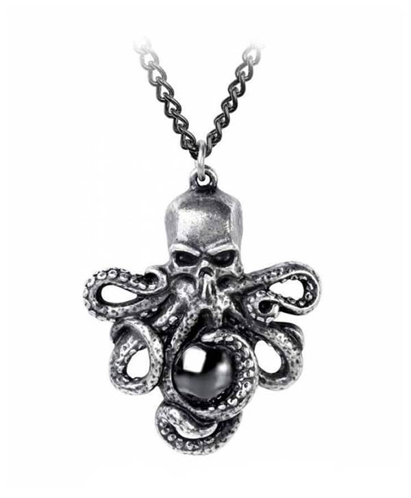 Licence ALCHEMY ENGLAND. Rozměry: cca 4,6 x 3,8 x 0,7 cm, řetěz cca 53 cm dlouhý. Kovový odlitekchobotnice ve tvaru lidské lebky držící grafitový kámen. Zavěšeno na černém řetězu připevněném karabinou.