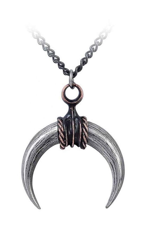 Kovový odlitek rohů ve tvaru půlměsíce. Součástí je černý řetízek se zapínáním na karabinu.