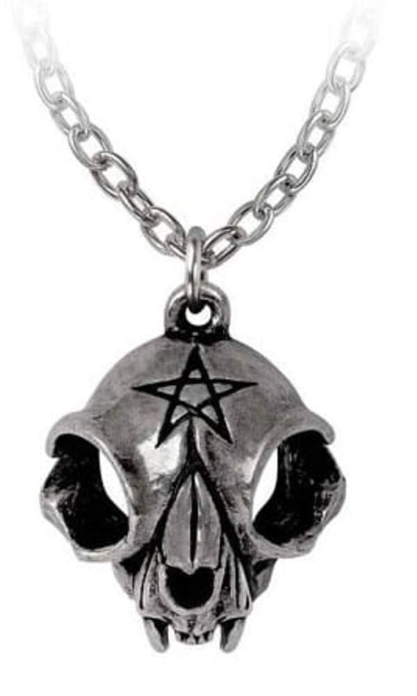Kovový odlitek (kočičí lebka s pentagramem ) zavěšený na řetízku stříbrné barvy se zapínáním na karabinku.