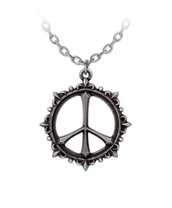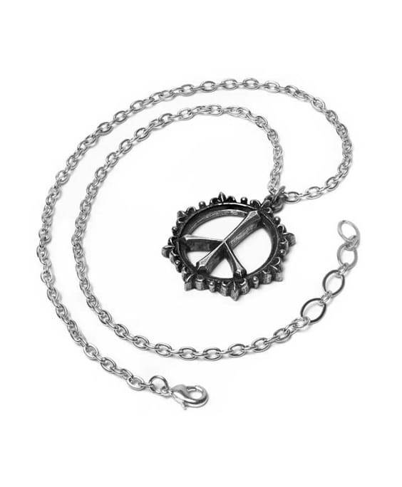 Licence - Import Alchemy England. Kovový odlitek ve tvaru gotické varianty klasického znaku míru. Zavěšeno na řetízku stříbrné barvy.