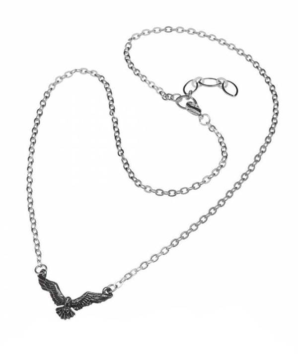 Kovový odlitek ve tvaru havrana. Zavěšeno na stříbrném řetízku. Upevněno karabinou.