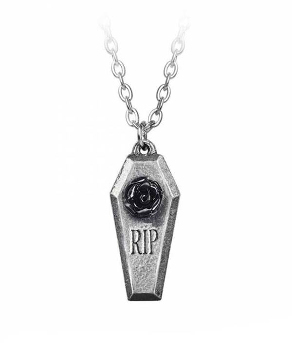 Kovový přívěšek ve tvaru rakve s černou růží. Zavěšeno na stříbrném řetízkupřipevněném karabinou.