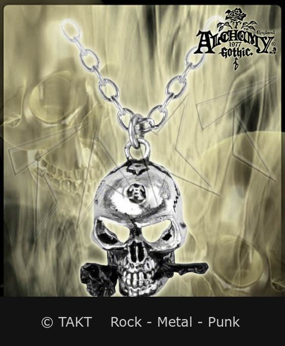 ALCHEMY ENGLAND. Kovový náhrdelník stříbrné barvy ve tvaru lebky. Zapínání na karabinku.