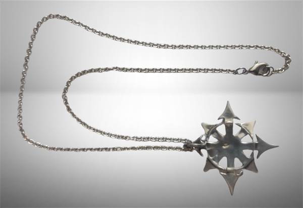 Přívěsek je vyroben z odlitku kovu v barvě starého stříbra, zavěšený na ozdobném řetízku se zapínáním na karabinku. Rozměry: přívěšek průměr cca 4 cm, délka řetízku cca 53 cm a tloušťka cca 0, 5 cm.