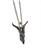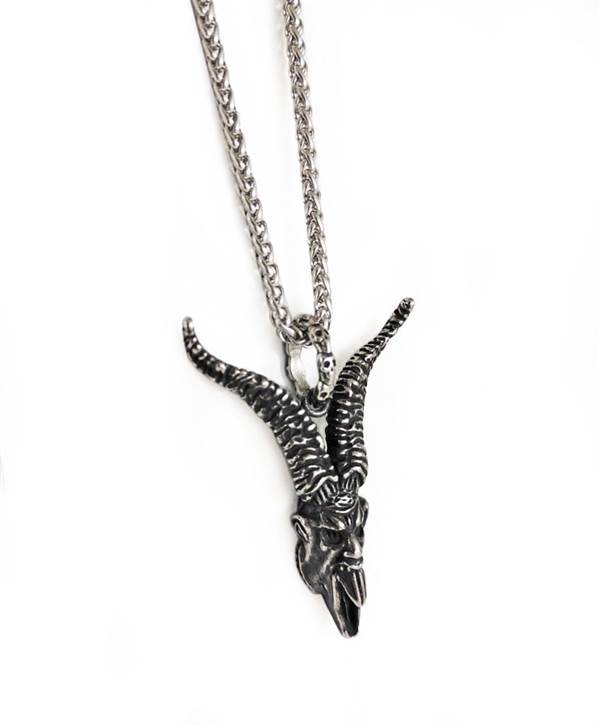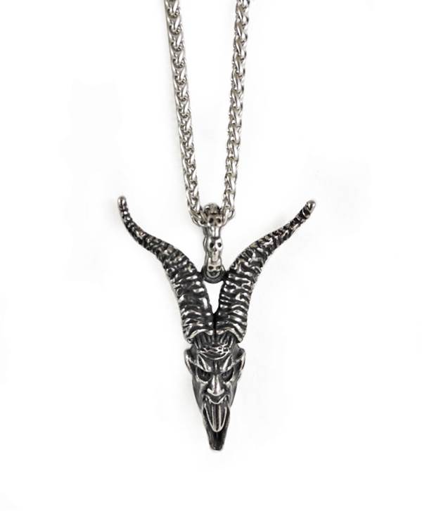 Masivní kovový odlitek hlavy ďábla zavěšený na ozdobném řetízku stříbrné barvy. Zapínání na karabinku.