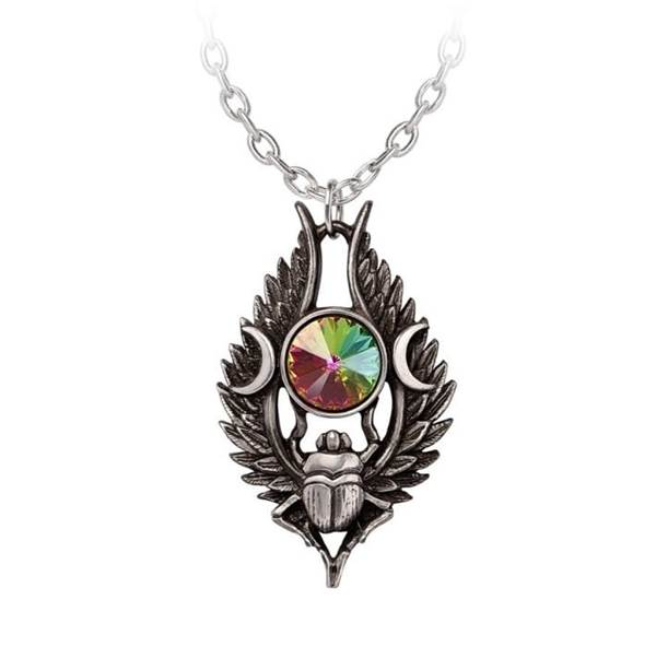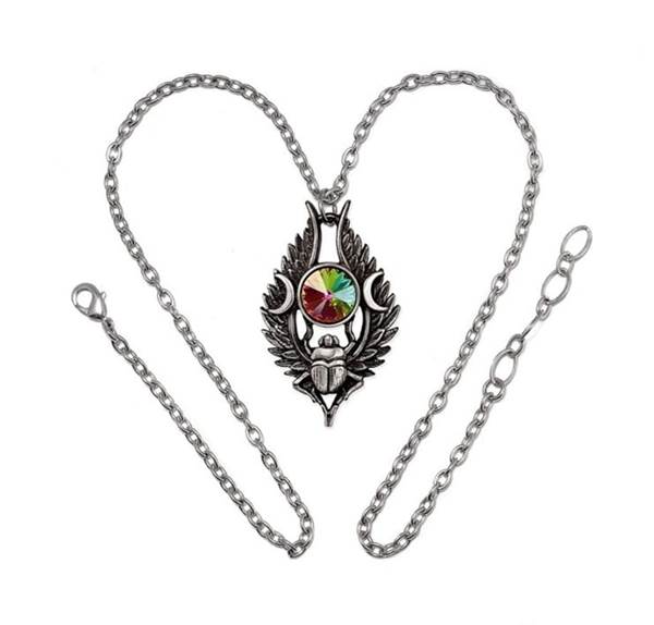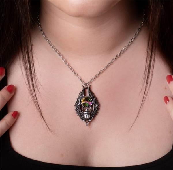 Ručně vyrobený z vysoce kvalitního cínu s černěnými a ručně leštěnými detaily, přívěšek zobrazuje posvátného skarabea, jenž je propleten se symbolem Trojitého měsíce. Tento motiv představuje transformaci, rovnováhu a sílu temné bohyně. Ve středu se nachází magický krystal s proměnlivými barvami, který zachycuje světlo a vytváří hypnotický efekt při každém pohybu.