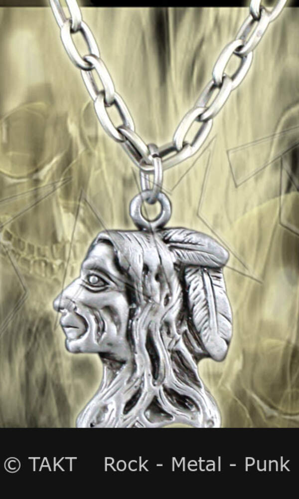 Působivý kovový přívěsek ve tvaru indián. Rozměry: přívěšek cca 3 x 3,5 cm, délka řetězu cca 64 cm.