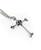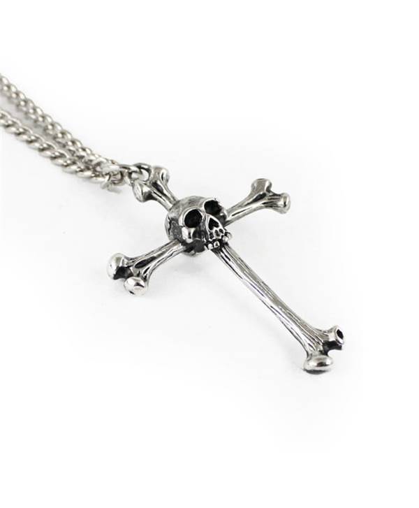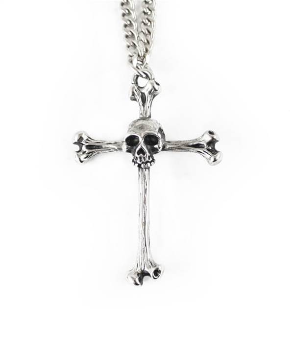 Masivní kovový odlitek ve tvaru kříže s lebkou. Barva: stříbrná. Řetízek se zapínáním na karabinu.