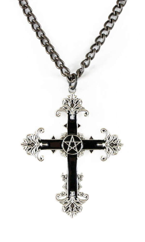 Kovový masivní odlitek ve tvaru kříže s pentagramem. Stříbrná barva s černou, lakovaný. Řetízek se zapínáním na karabinu.