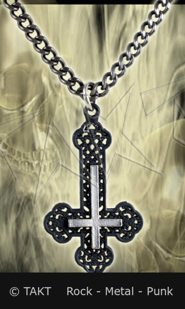 Přívěšek je vyroben z odlitku kovu stříbrno - . Barva: černá ve tvaru kříže, který je zavěšen na černém řetízku. Rozměry:přívěšku cca 6, 5 x 10 cm, délka řetězu cca 52 cm.