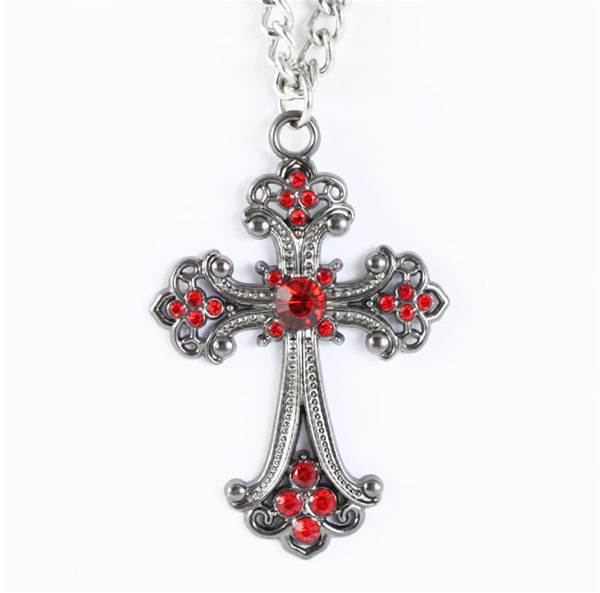 Přívěsek kříž Gothic 06 je výrazný gotický šperk ve stříbrném odstínu, který zaujme svým masivním vzhledem a detailním zpracováním. Tento přívěsek je vyroben z kvalitního kovového odlitku, jehož povrch je lakovaný pro lepší odolnost a trvalý lesk. Dominantním prvkem jsou sytě červené kameny, které vytváří dramatický kontrast a podtrhují mystický nádech celého designu.