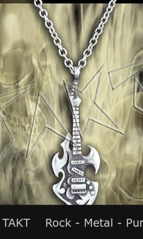 Odlitek kovu v barvě starého stříbra, zavěšený na řetízku. Rozměry: přívěšek cca 2 x 5,5 cm, délka řetízku cca 50 cm.