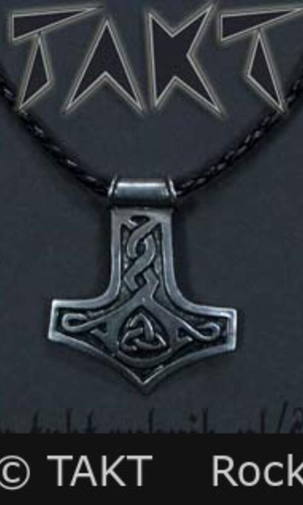 Masivní kovový oboustranný odlitek ve tvaru Thorova kladiva. Zavěšený na ozdobném řetízku, zapínání na karabinku. Součástí je přívěsek a řetízek. Rozměry: přívěsek cca 5 x 4 cm, délka řetízku cca 51 cm, šířka cca 0, 4 cm