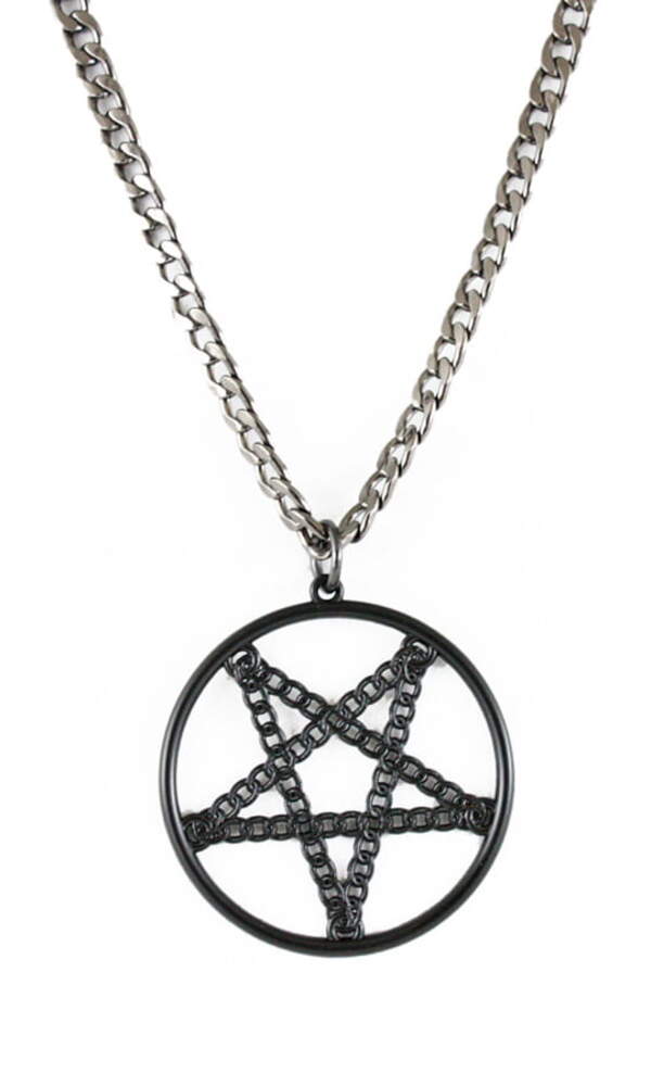 Kovový odlitek ve tvaru pentagramu, černý. Řetízek se zapínáním na karabinu.