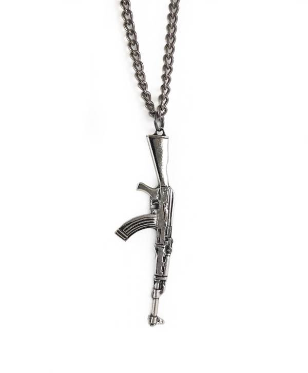 Kovový odlitek ve tvaru pušky stříbrné barvy, zavěšený na ozdobném řetízku. Zapínání na karabinku.