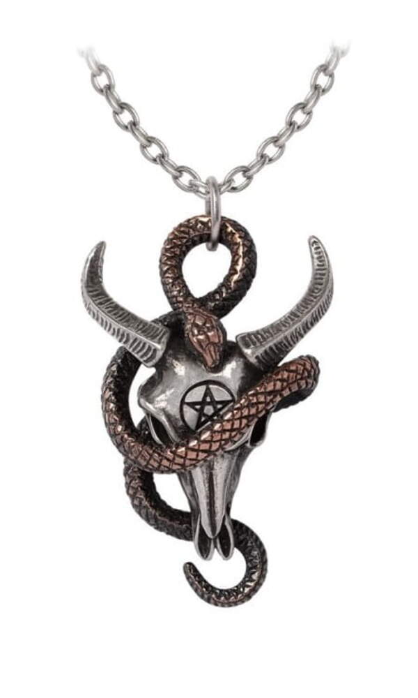 Přívěšek Servant Of Baphomet je těžkým, výrazným symbolem mystiky, síly a esoterické rovnováhy. Tento ručně vyrobený klenot je odlitek z kvalitního anglického cínu v antickém provedení. V jeho středu se nachází lebka berana s vyrytým pentagramem – symbolem jednoty ducha a hmoty. Okolo lebky se obtáčí had v měděném odstínu, reprezentující proměnu, znovuzrození a skrytou moudrost.