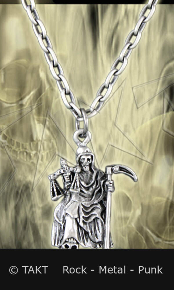 Působivý kovový přívěsek ve tvaru smrtky. Rozměry: přívěšek cca 2,5 x 3,5 cm, délka řetězu cca 47 cm, řetěz cca 0,4 x 0,6 cm.