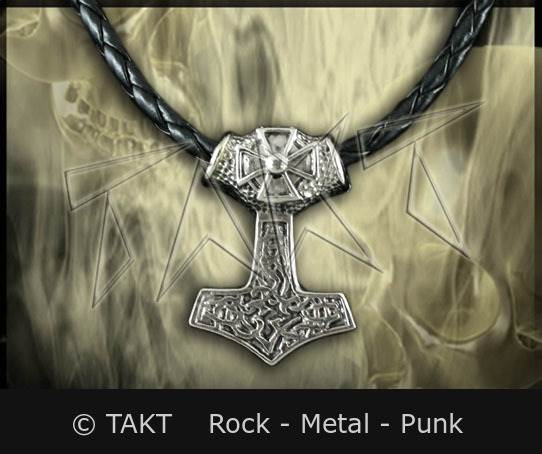 Masivní kovový oboustranný odlitek ve tvaru Thorova kladiva. Zavěšený na ozdobném řetízku, zapínání na karabinku. Součástí je přívěsek a řetízek. Rozměry: přívěsek cca 5 x 4 cm, délka řetízku cca 51 cm, šířka cca 0, 4 cm