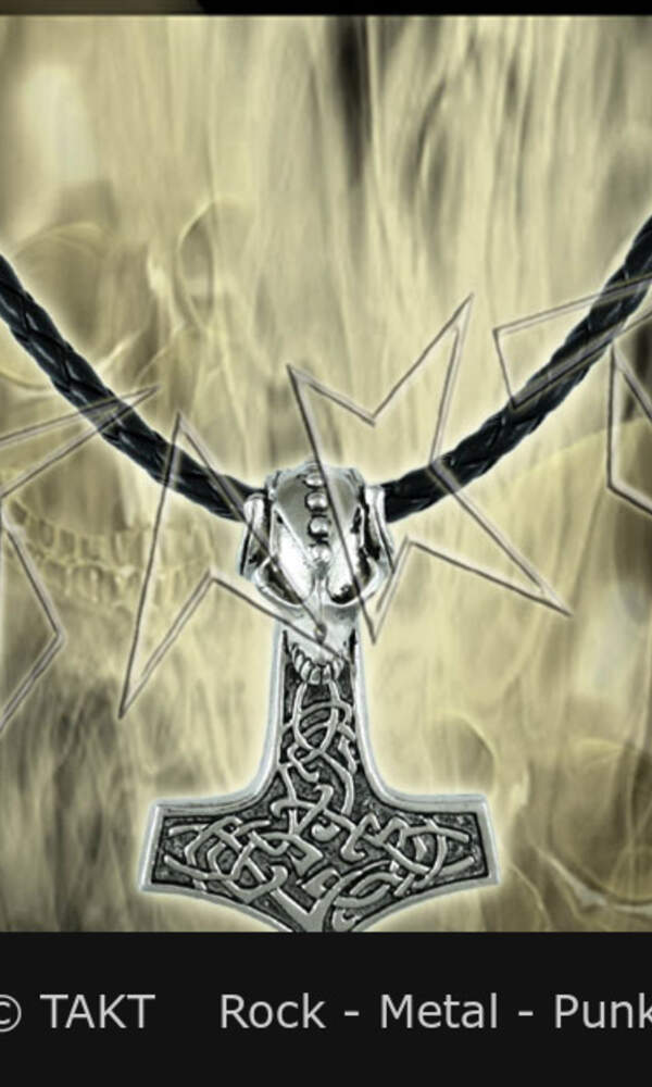 Masivní kovový oboustranný odlitek ve tvaru Thorova kladiva. Zavěšený na ozdobném řetízku, zapínání na karabinku. Součástí je přívěsek a řetízek. Rozměry: přívěsek cca 5 x 4 cm, délka řetízku cca 51 cm, šířka cca 0, 4 cm