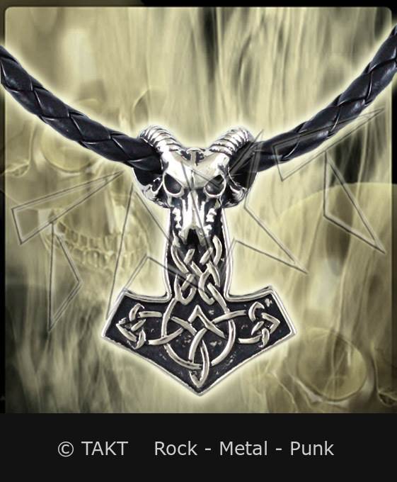 Pevný kovový odlitek ve tvaru Thorova kladiva zavěšený na řetězu, který drží dvě vlčí hlavy. Barva: stříbrná. Celkové provedení s karabinou. Rozměry: Thorovo kladivo cca 3 x 4, 5 cm, řetěz dlouhý cca 64 cm.