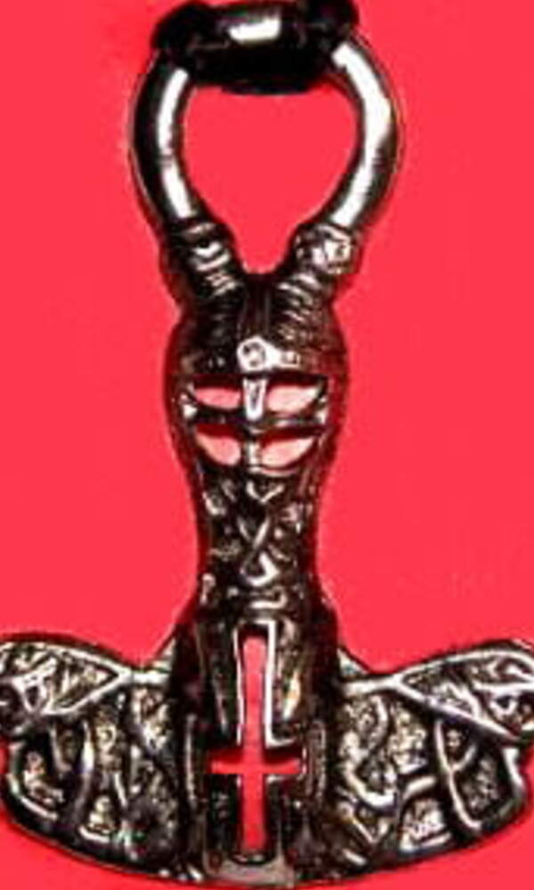 Masivní kovový oboustranný odlitek ve tvaru Thorova kladiva. Zavěšený na ozdobném řetízku, zapínání na karabinku. Součástí je přívěsek a řetízek. Rozměry: přívěsek cca 5 x 4 cm, délka řetízku cca 51 cm, šířka cca 0, 4 cm