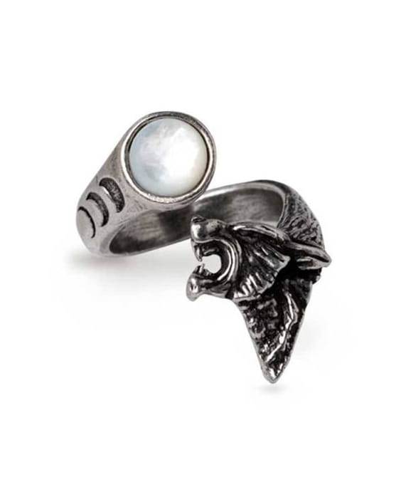 Licence - Import Alchemy England. Prsten - vyjící vlk hledící na perleťový měsíc, z boku prstenu jsou vyryté fáze měsíce. Vytváří úžasný vizuální efekt. Prsten lze mírně rozšířit nebo zúžit pro lepší usazení na prstě.