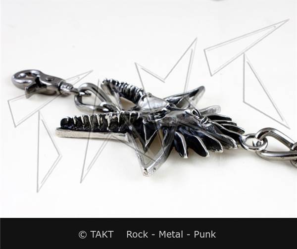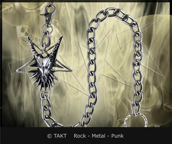 velmi masivní ozdobný řetěz ke kalhotům stříbrné barvy s ozdobou ve tvaru pentagramu, délka cca 60 cm, zakončený kroužkem a karabinkou. Ozdobný element o velikosti cca 8 x 8 cm.