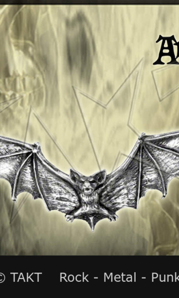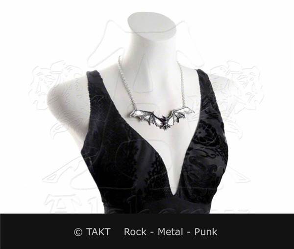 ALCHEMY ENGLAND. Kovový náhrdelník stříbrné barvy ve tvaru netopýr. Zapínání na karabinku.