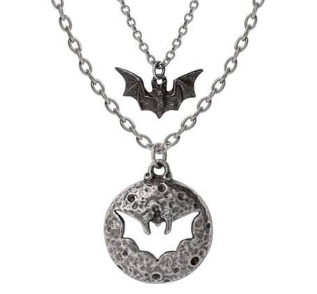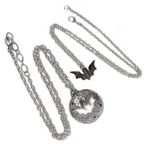 ROZMĚRY: Měsíc: 35 mm x 31 mm x 6 mm, Netopýr: 15 mm x 24 mm x 6 mm, Hmotnost: 26 g (Poznámka: Rozměry náhrdelníku nezahrnují zapínání.)