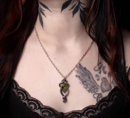 Řetízek na krk – Light In The Dark je jedinečný šperk s temně elegantním designem, který perfektně doplní gothic, alternativní i metalový outfit. Dominantou přívěsku je duhově se třpytící kámen vsazený do detailně zpracovaného kovového rámu s ornamenty připomínajícími hadí linie nebo starobylé symboly.