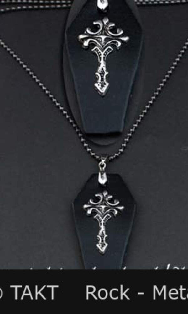 Přívěšek je vyroben z odlitku kovu stříbrno - . Barva: černá ve tvaru kříže, který je zavěšen na černém řetízku. Rozměry:přívěšku cca 6, 5 x 10 cm, délka řetězu cca 52 cm.