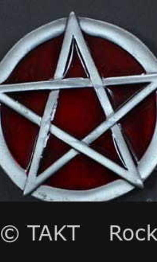 Masivníodlitekkovu, lakovaný. Barva: stříbrná. Se symbolem pentagramu. Průměr spony je cca 8 cm a maximální šířka opasku k této sponě je 4, 5 cm. Velmi pěkné provedení.